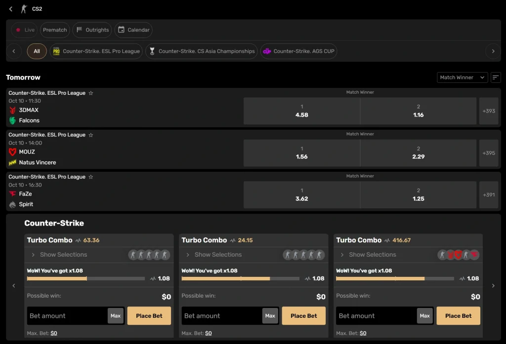• eSports: The future of sports is here, and we offer a wide variety of markets on popular games like CS:GO and Dota 2.